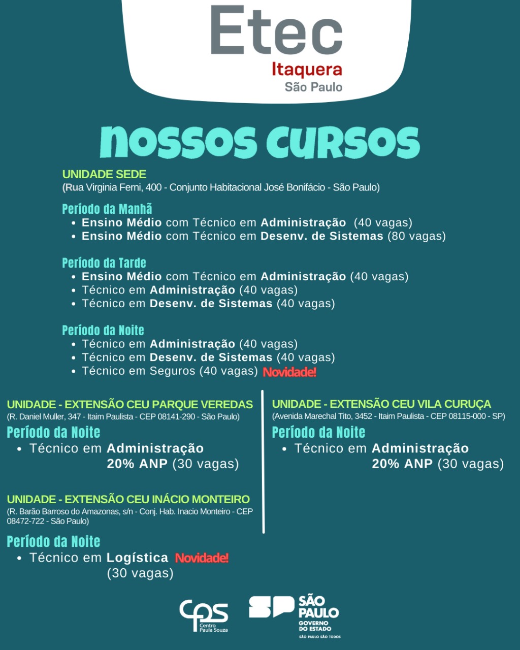 A Etec de Itaquera oferece Ensino Médio integrado aos cursos técnicos de Administração e Desenvolvimento de Sistemas para os candidatos que estão concluindo o 9° ano do Ensino Fundamental, então não percam essa oportunidade incrível de fazer um ensino de qualidade na Etec de Itaquera! A unidade oferece 80 vagas para o Ensino Médio com Técnico em Desenvolvimento de Sistemas no período da manhã e 40 vagas para Ensino Médio com Técnico em Administração no período da manhã e 40 vagas para o período da tarde.